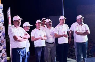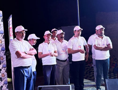 A group of people dressed in formal attire with orange ties are posing for a group photo indoors. The background features intricate ceiling patterns and two flags, one of which is the Indian flag. The individuals are showing gestures with their hands, and there is a sense of unity and formality.